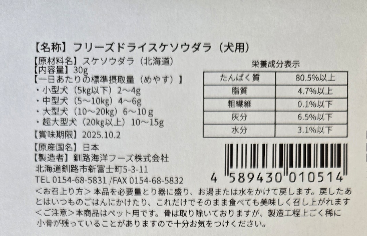 北海道産のスケソウダラのほぐし身とスケソウダラの骨とハラスを粉末にした粉を